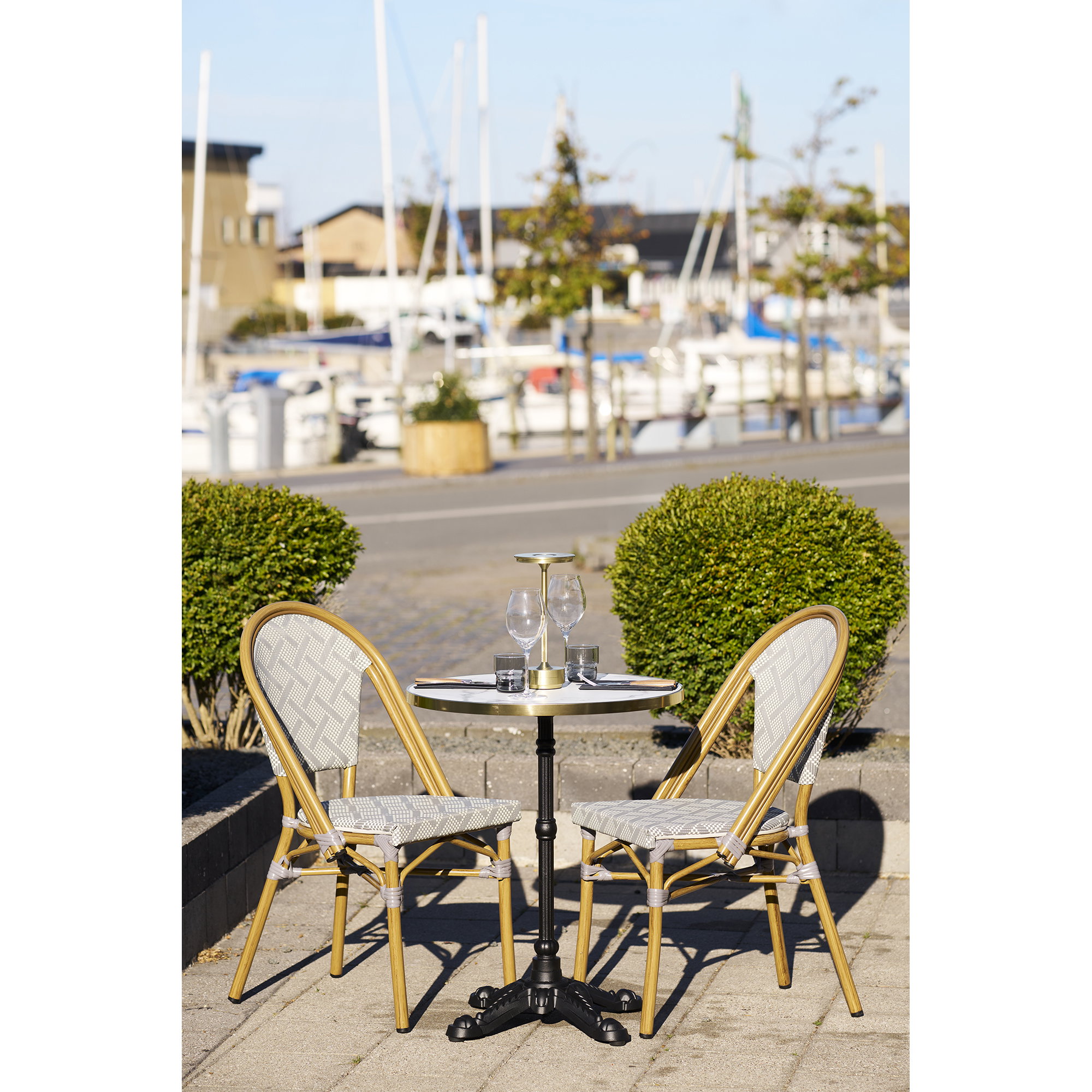 Bistro stalas, marmuro išvaizda, balta su auksine kraštu, juodos kojos, geležis<br>ø60x73 cm