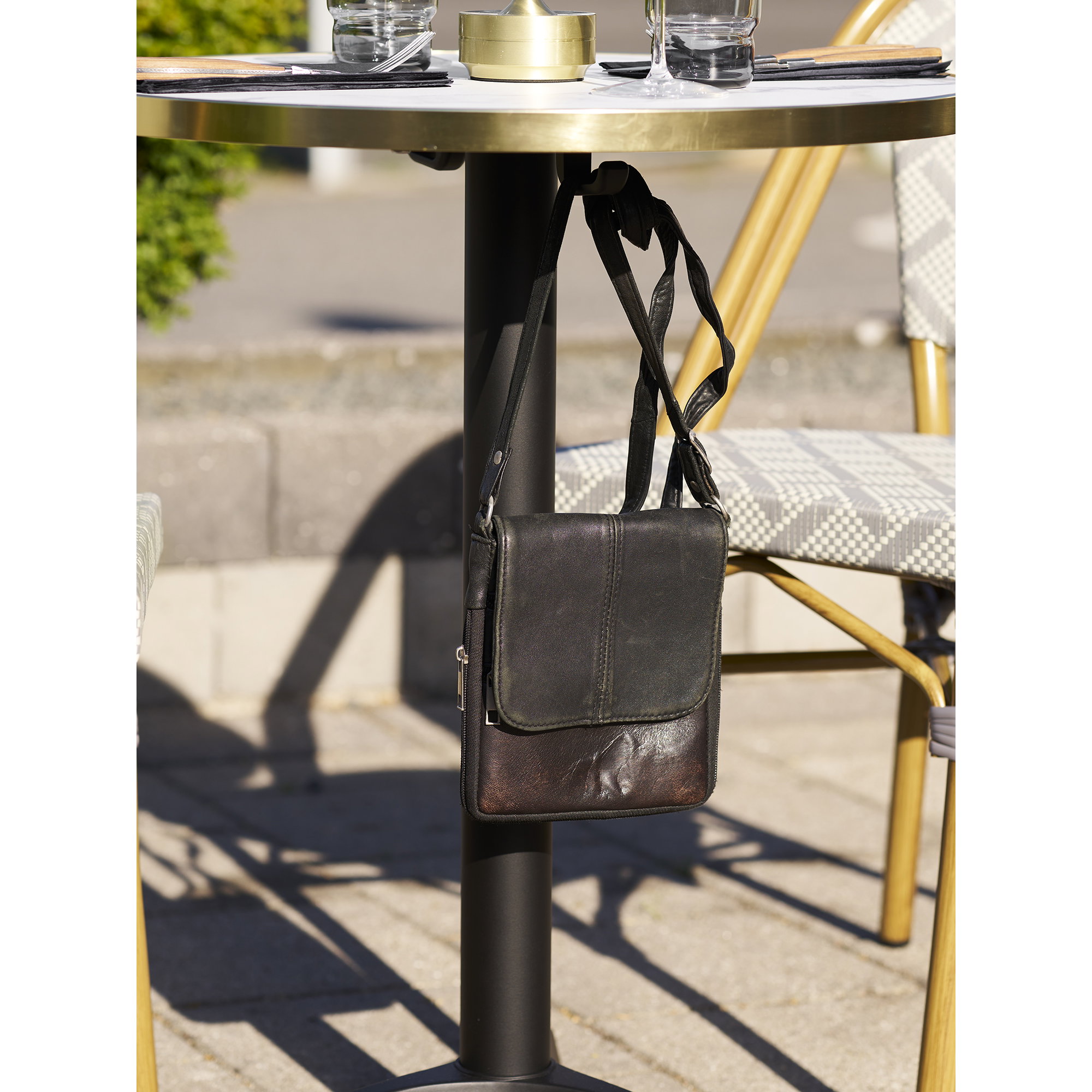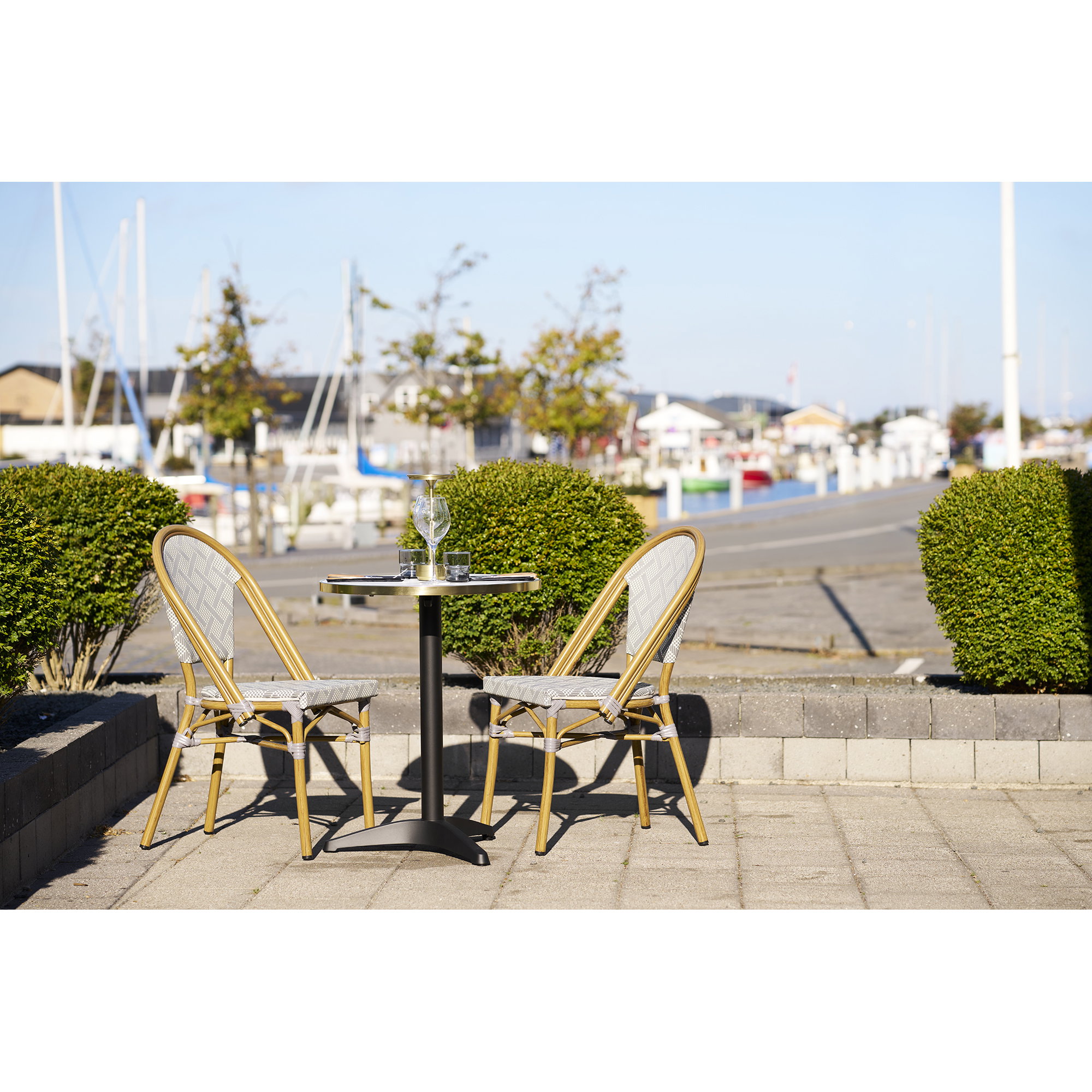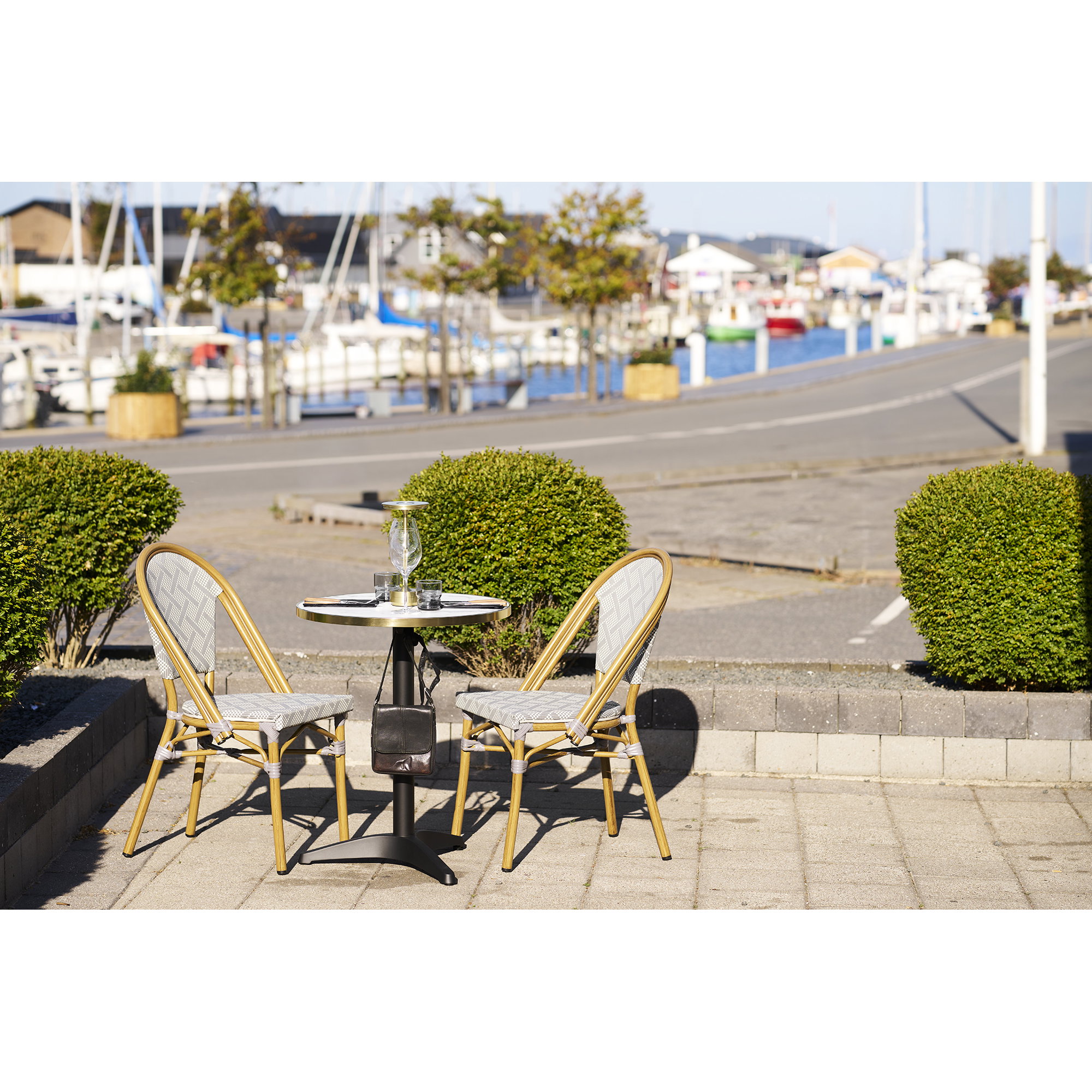 Bistro stalas, marmuro išvaizda, balta su auksine kraštu, juodos kojos, aliuminis<br>ø60x73 cm
