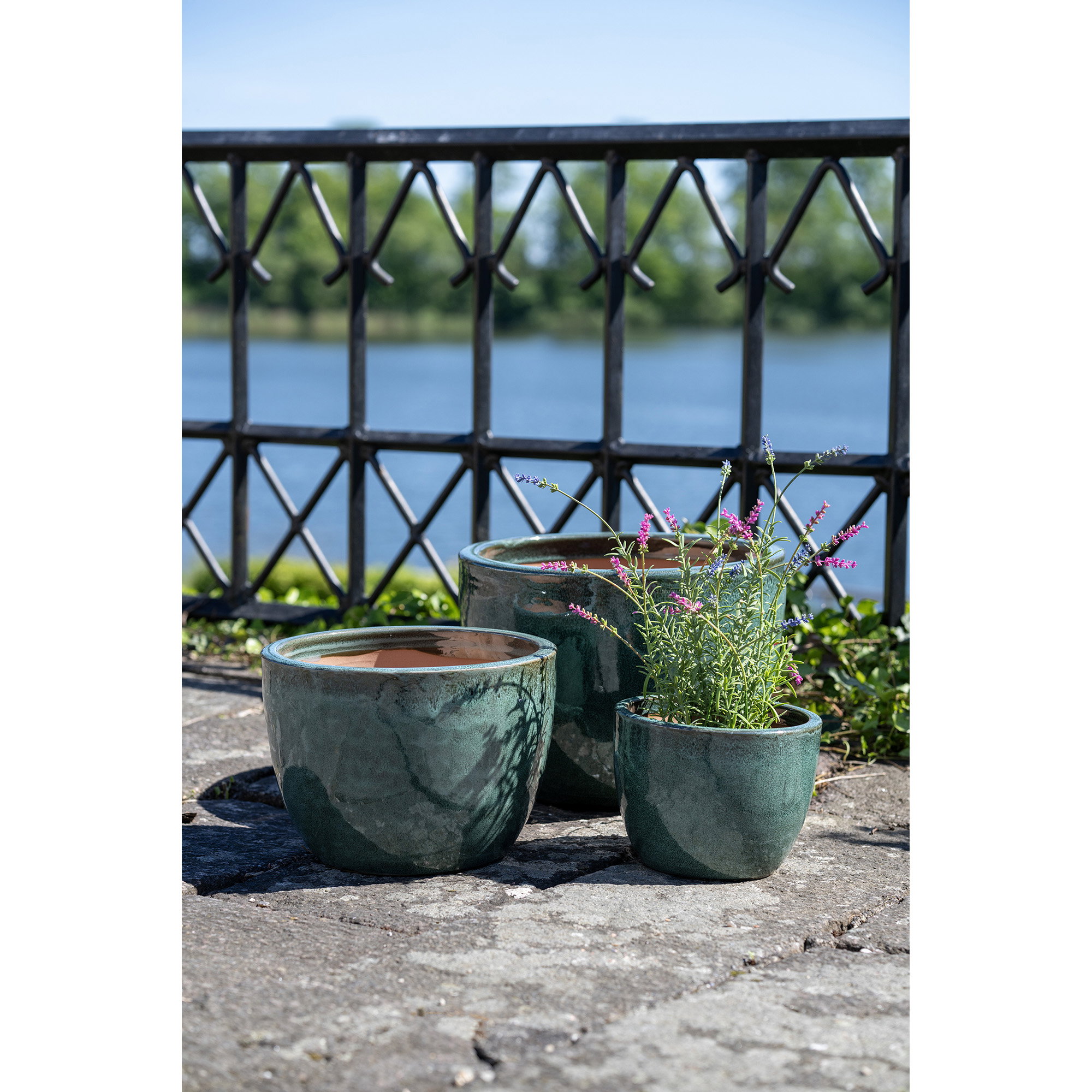 Pots, glazed ceramics, drainage hole in the bottom, green<br>set of 3,