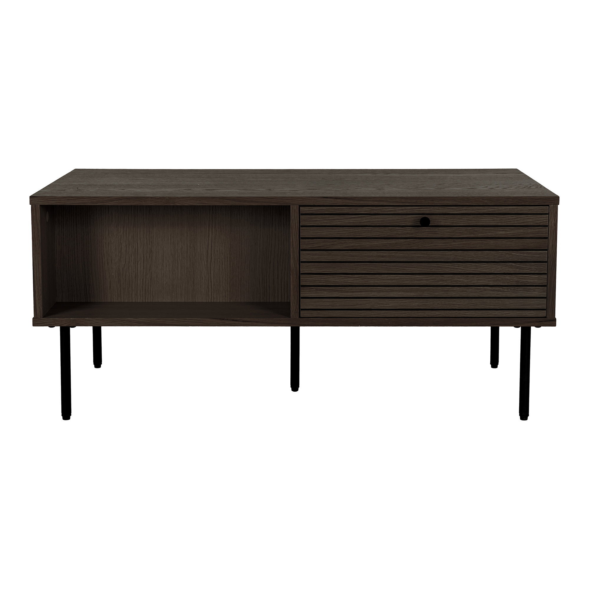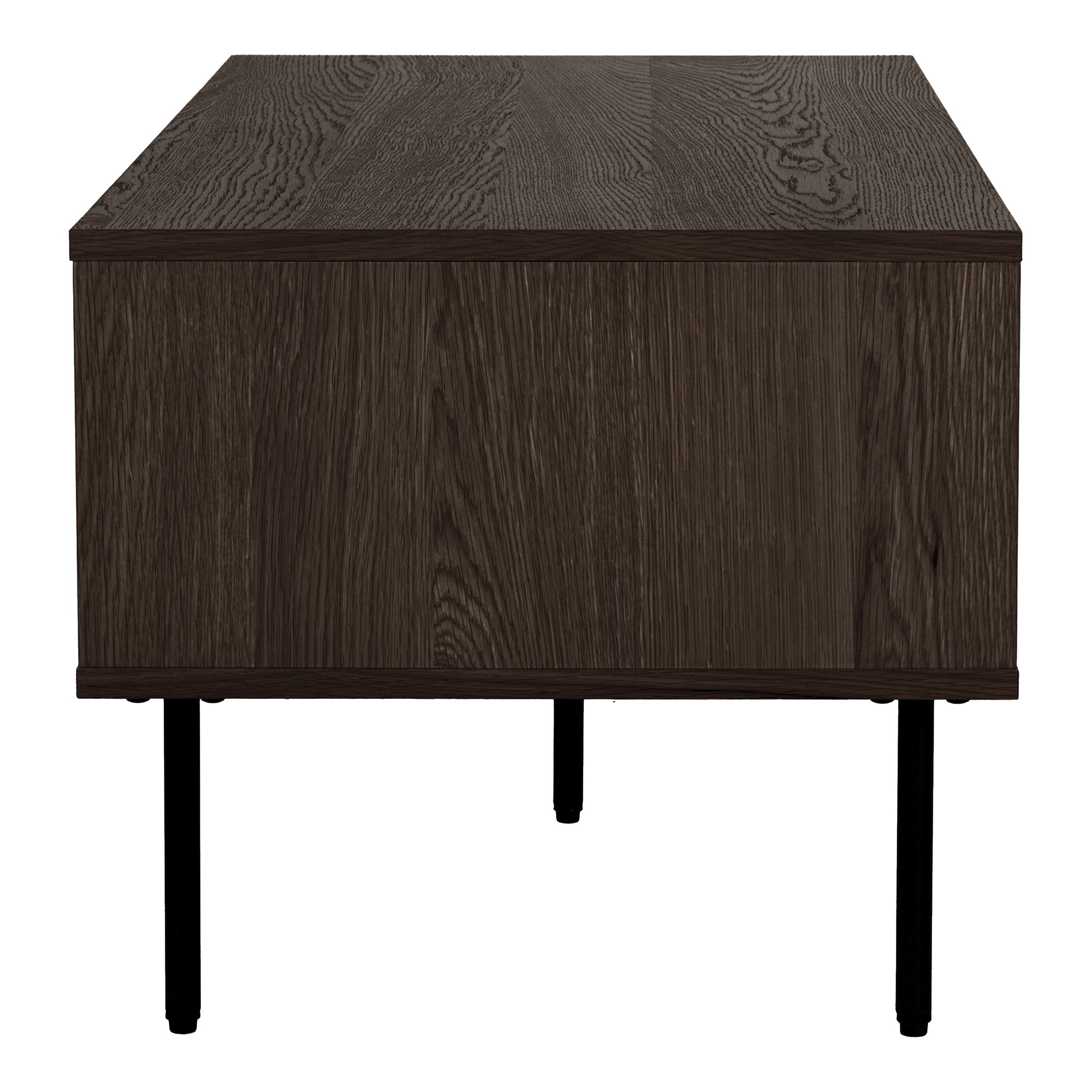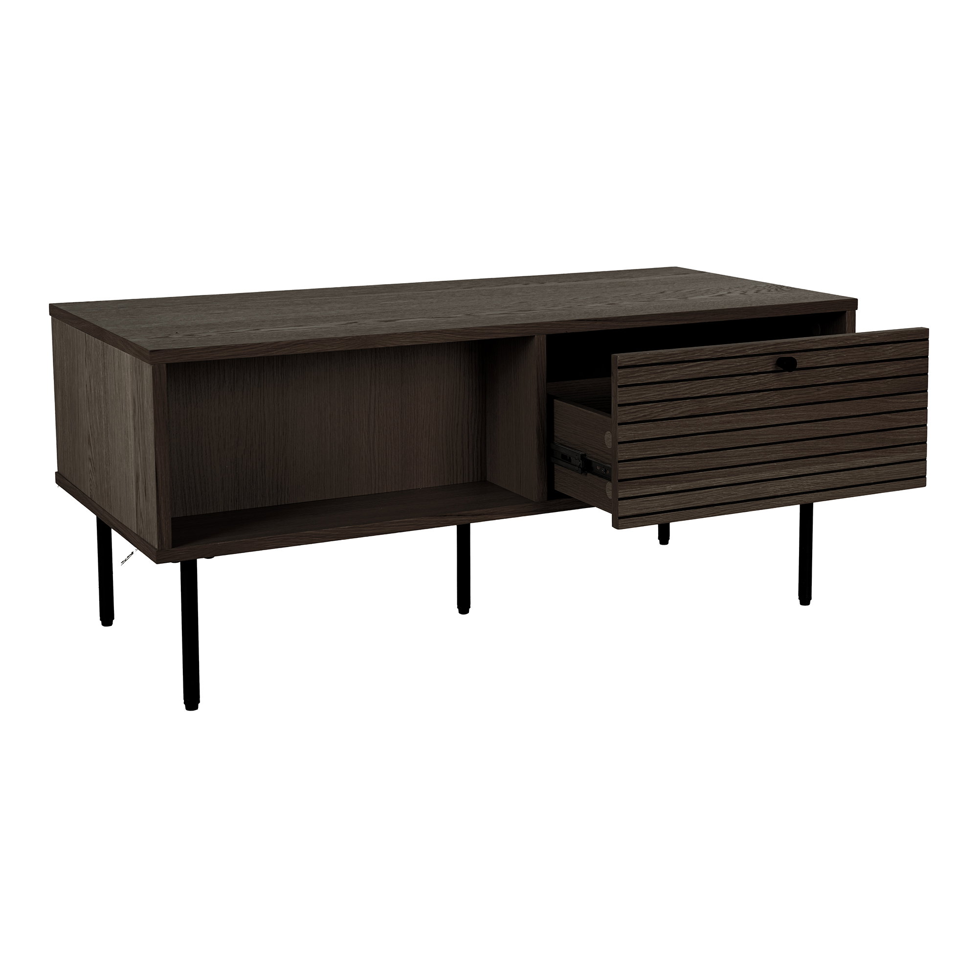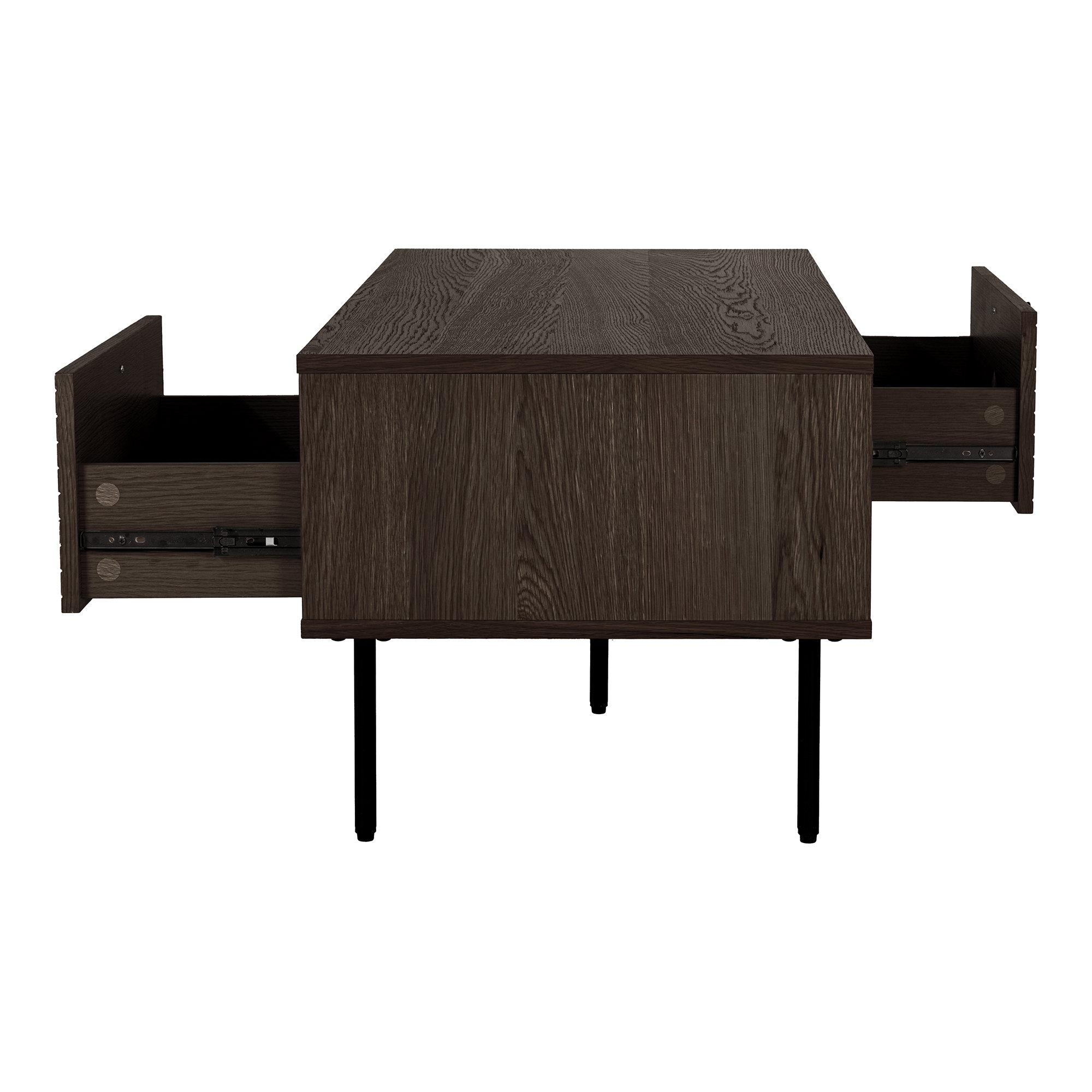 Kavos staliukas, 2 stalčiai, ąžuolo faneruotė, dūminės spalvos, juodos metalinės kojos<br />50x100x45 cm