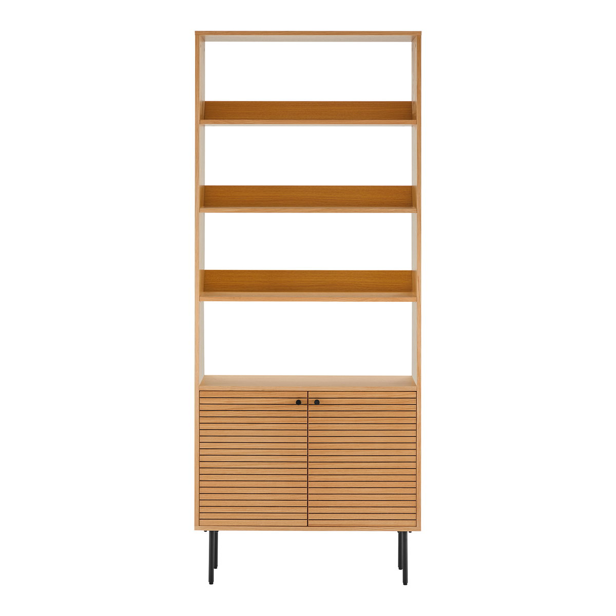 Knygų lentyna su 2 durelėmis, 4 lentynos, ąžuolo faneruotė, natūrali spalva, juodos metalinės kojos<br>80x30x200 cm