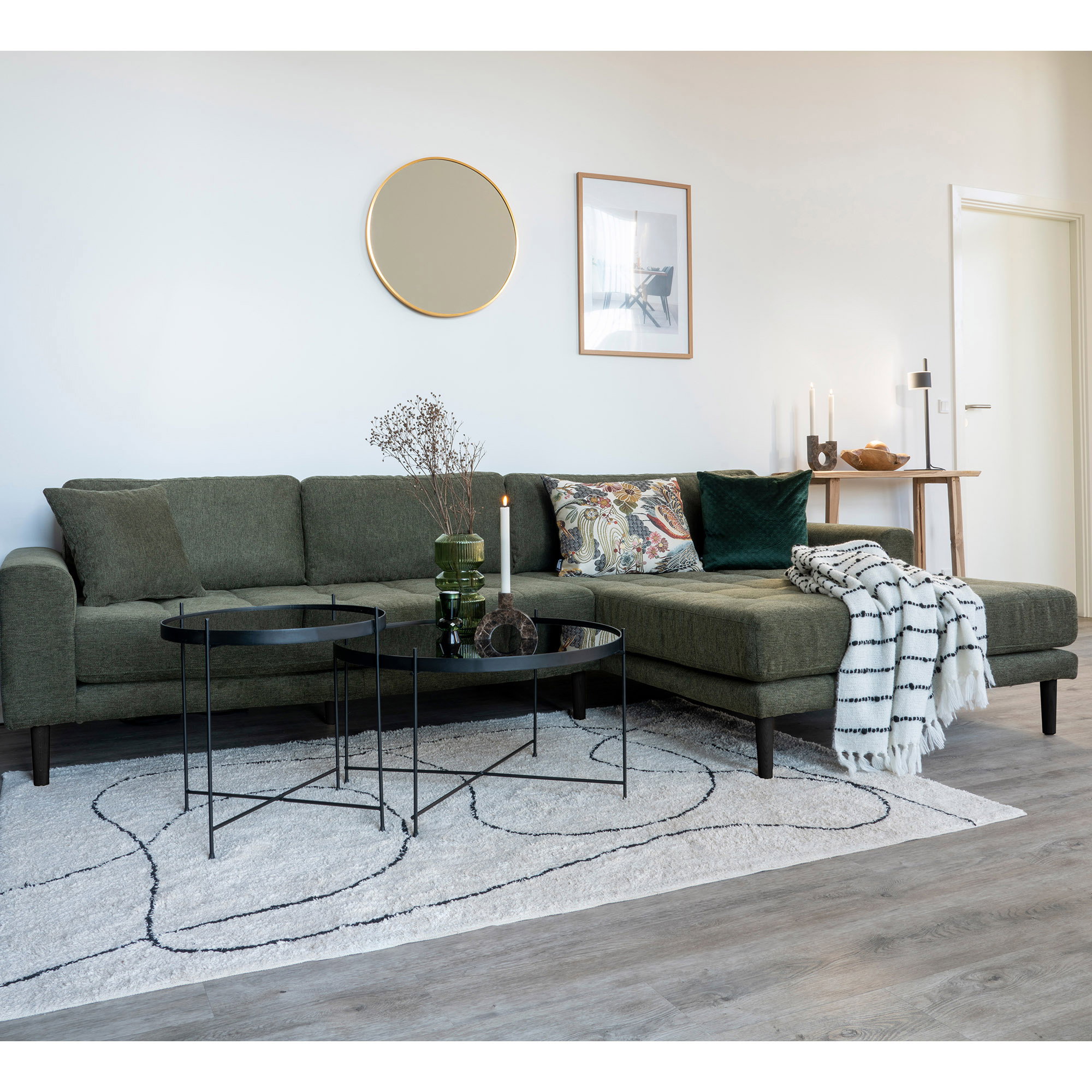 Poilsio sofa, dešinės pusės, alyvuogių žalios spalvos, su keturiomis pagalvėlėmis ir juodos medienos kojelėmis.<br />HN1020