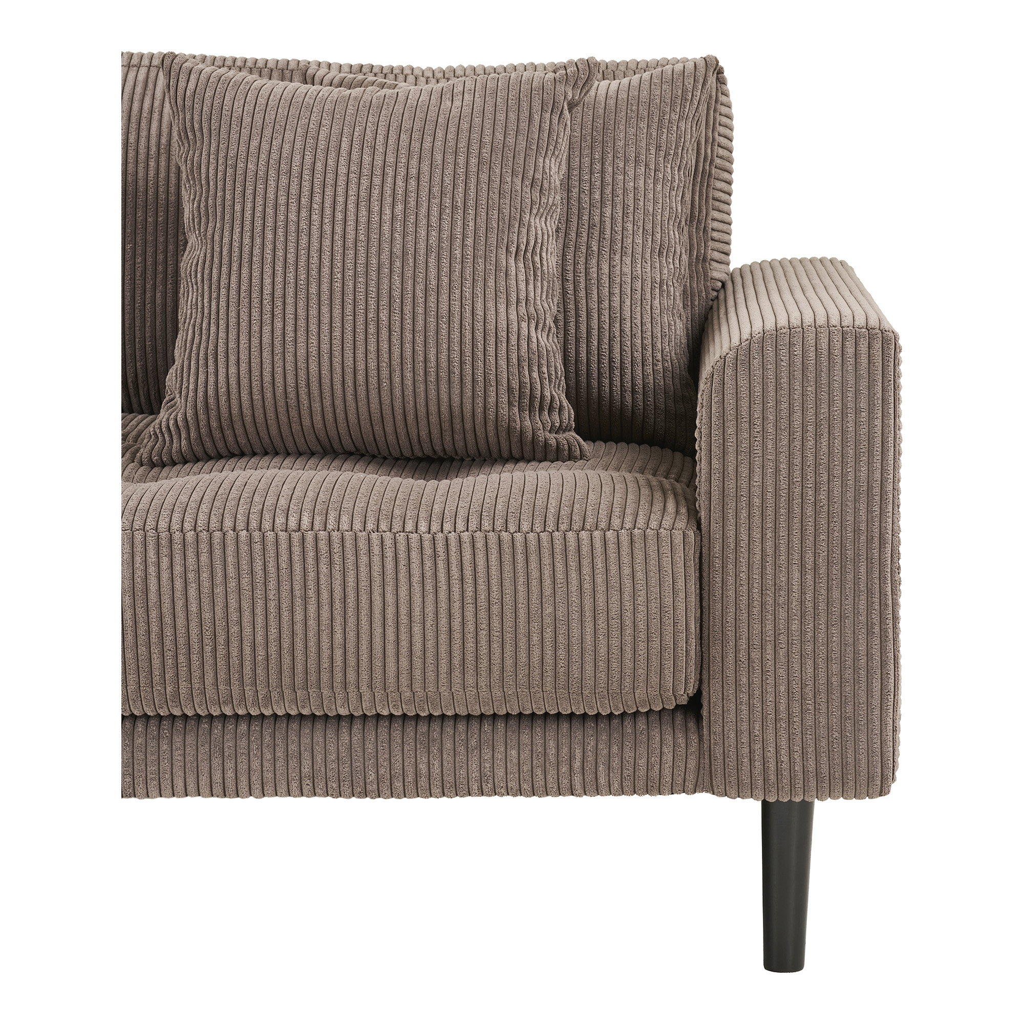 Poilsio sofa, kairės pusės, rudu kordiniu audiniu, su keturiomis pagalvėlėmis ir juodos medienos kojelėmis.<br />HN1423